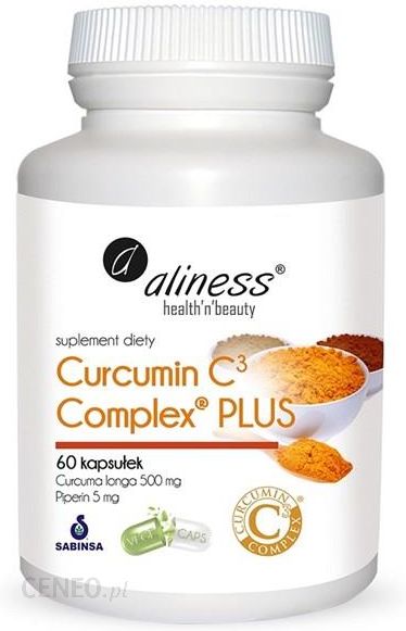 ALINESS Curcumin C3 complex PLUS z piperyną 500mg/5mg 60 kaps Aliness Curcumin Complex3 PLUS to kompozycja w 100% naturalnych kurkuminoidów, w postaci opatentowanego ekstraktu z kurkumy CurQreal®. W skład kompleksu wchodzą trzy związki chemiczne występujące naturalnie w kurkumie: kurkumina, desmetoksykurkumina (DMC) i bis-desmetoksykurkumina (BDMC). Aby zwiększyć biodostępność kurkuminoidów, skład wzbogacono o naturalny ekstrakt z pieprzu ACTAMIDE®, który zawiera 95% piperyny i jest pozyskiwany wyłącznie na drodze wodnej ekstrakcji.