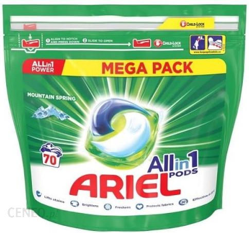 Ariel Allin1 zapewnia wyjątkową moc piorącą w jednej małej kapsułce. Kapsułki do prania Ariel Allin1 PODS Mountain Spring mają unikalną wielokomorową budowę, która sprawia, że składniki są od siebie odseparowane i nie łączą się ze sobą aż do chwili rozpoczęcia prania, dzięki czemu zapewniają wyjątkowo skoncentrowaną moc piorącą. Innowacyjna powłoka kapsułek do prania Ariel ulega całkowitemu rozpuszczeniu w kontakcie z wodą, uwalniając specjalne formuły, które pozwalają usuwać wiele różnych rodzajów plam. Kapsułki Ariel to najlepszy środek piorący Ariel w płynnej formie, zawierający odpowiednią ilość poszczególnych składników piorących. Użyj również płynu do płukania Lenor oraz perełek zapachowych Unstoppables do stosowania podczas prania, aby zapewnić swoim ubraniom jeszcze większą miękkość i świeżość.Doskonałe usuwanie plam już w 1. praniu, nawet w zimnej wodzieSprawiają, że ubrania wyglądają olśniewająco czysto i pachną świeżościąZapewniają doskonałe efekty prania nawet w przypadku trudnych plamPowłoka ulega całkowitemu rozpuszczeniu w kontakcie z wodąŁatwe w użyciu: nie wymagają odmierzania ani wlewania