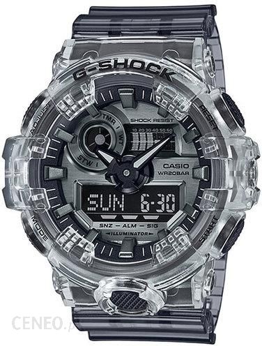 Zegarek męski CASIO G-SHOCK GA-700SK-1AER – wyjątkowy model japońskiego producenta. Niezwykła odporność na uderzenia i wstrząsy, piach czy wodę sprawia, iż od końca ubiegłego wieku seria cieszy się niezwykłą popularnością na całym świecie. Niezwykłe zegarki noszone przez gwiazdy telewizji i sportu stały się obiektem pożądania nie tylko dla osób aktywnych i uprawiających sport. Do tej pory żadna sportowa seria zegarków kwarcowych nie osiągnęła takiej popularności jak G-shock.Męski zegarek G-shock GA-700SK-1AER – oryginalny z transparentną budową to jeden z najładniejszych modeli wśród całej gamy sportowych zegarków CASIO. Idealne rozmiary godne prawdziwego faceta oraz szereg funkcji powodują, że jest to jeden z tych modeli, które budzą ogromne zainteresowanie. Przezroczysta koperta i pasek idealnie komponują się z szaro – czarną tarczą. Model posiada stoper z funkcją prędkościomierza (tachymetr), timer do odliczania czasu wstecz, alarmy z funkcją drzemki, czas światowy, wieczny kalendarz oraz podświetlenie diodowe. Multi-funkcyjny mechanizm zamknięto w kopercie o wysokiej wodoszczelności aż 200m (20BAR) która pozwala na swobodne nurkowanie z zegarkiem na ręce.INFORMACJE DODATKOWE: – PRODUKT CASIO G-SHOCK GA-700SK-1AER FABRYCZNIE NOWY – ORYGINALNE OPAKOWANIE CASIO G-SHOCK; – INSTRUKCJA OBSŁUGI W J.POLSKIM W FORMIE PAPIEROWEJ.