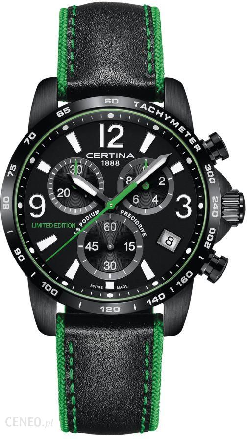 KOPERTA:Kształt – okrągłyMateriał – stal szlachetna pokryta powłoką PVDSzkło – szafirowe z powłoką antyrefleksyjną – niezwykle odporne na zarysowaniaSzerokość koperty – 41mmWysokość koperty – 41mmGrubość – 11,70mmWaga – 80,00gWodoszczelność – 10bar (100m)Kolor – czarnyTARCZA I WSKAZÓWKI:Kolor tarczy – czarnyZnaczniki godzin – indeksy, cyfry arabskieFluorescencyjne wskazówki pokryte substancją luminescencyjną Super-LumiNova® PASEK:Materiał – skóraKolor – czarny / zielonySzerokość – 20,00mmZapięcie – motylkowe, wygodne i bezpieczneFUNKCJE:-Limitowana edycja 999 egzemplarzy na cały świat!-godziny, minuty, sekundy-datownik-stoper (chronograf) – jego wskazania odczytywane są na dodatkowych tarczach cyferblatu-tachymetr – funkcja zegarka służąca do pomiaru prędkości średniej na określonym odcinku drogi-DS (Double Security) – podwójne zabezpieczenie mechanizmu-funkcja EOLPARAMETRY MECHANIZMU:Typ – kwarcowy ETA G10.212 AA PRECIDRIVE (zasilanie baterią Renata 394)Rozmiar – 23,30mmWysokość – 5,25 mmIlość kamieni – 6
