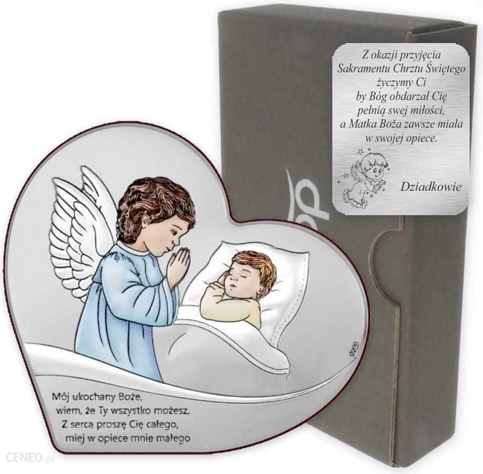 Obrazek srebrny z wizerunkiem Aniołka czuwającego nad dzieciątkiem stanowi idealny prezent z okazji Chrztu Świętego. Z przodu obrazka został fabrycznie wygrawerowany napis „Mój ukochany Boże wiem, że Ty wszystko możesz. Z serca proszę Cię całego, miej w opiece mnie małego”.Obrazek wyprodukowany został przez firmę Dono. Gwarantuje ona, iż przedmiot nabyty przez Państwa został wyprodukowany we Włoszech, zgodnie z kunsztem i tradycją obróbki metali szlachetnych. Obrazek wykonany jest z blachy aluminium pokrytej warstwą srebra. Całość zabezpieczona jest warstwą lakieru, która chroni przed czynnikami zewnętrznymi. Wpływa to na bezproblemowe użytkowanie bez potrzeby częstego czyszczenia.Obrazek można zarówno powiesić, jak i postawić na dołączonej podstawce.Do czyszczenia zalecamy używanie wyłącznie czystych, miękkich ściereczek, a w przypadku zabrudzeń letniej wody. Nie należy stosować detergentów, alkoholu ani znajdujących się w sprzedaży środków i ściereczek do czyszczenia srebra, gdyż mogą one uszkodzić warstwę ochronną.