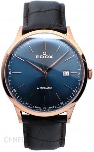 Edox 80106 37RC BUIR to elegancki i klasyczny, męski zegarek z kolekcji Les Vauberts. Szwajcarski producent zadbał w tym modelu o najwyższą jakość wykonania. Koperta zegarka w rozmiarze 41mm (mierzone bez koronki) wykonana jest z wysokiej jakości stali szlachetnej pokrytej powłoką w kolorze różowego złota. Szkiełko zegarka wykonane jest z syntetycznego szafiru i gwarantuje najwyższą odporność na zarysowania (9 w skali Mohsa – twardszy jest tylko diament). Niebieska tarcza zegarka ozdobiona jest szlifem słonecznym i posiada nakładane indeksy godzinowe. Wskazówki i indeksy pokryte są powłoką w kolorze rose gold. Wodoszczelność na poziomie 50m pozwala na zachlapanie. Zegarek napędza automatyczny, szwajcarski mechanizm Sellita SW-200 (26 kamieni, 38 godzin rezerwy chodu) znany z niezawodności i dokładności. Posiada funkcję ręcznego dokręcania, stop-sekundy i datownika. Pracuje z częstotliwością 28,800 bph, 4Hz, która gwarantuje bardzo płynny ruch wskazówki sekundnika oraz precyzję w odmierzaniu czasu.