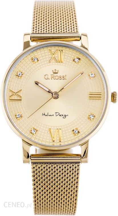 Zegarki marki G. Rossi to przede wszystkim wysoka jakość materiałów, niezwykła dokładność wykonania, dbałość o szczegóły, sprawdzony oraz niezawodny mechanizm, a także nawiązania do włoskiego designu.Odpowiadają one na najnowsze trendy we wzornictwie, a kunszt ich wykonania dowodzi, iż dopiero kreatywne połączenie klasyki z nowoczesnością, tworzy modny, elegancki i często nieodzowny dodatek będący ozdobą oraz wykończeniem każdego stroju.POWŁOKA IPS / IPG / IPR / IPBPokrywanie powłoką IP jest innowacyjną, jonową metodą pozłacania bądź posrebrzania wierzchniej warstwy czasomierzy poprzez rozpylanie złotego proszku połączonego z innym metalem. Stworzona w wyniku tego procesu powłoka jest gładka, odporna na ścieranie i zachowująca głębię koloru.METALOWA BRANSOLETAMetalowa bransoleta zegarka jest bardzo wytrzymała na uszkodzenia mechaniczne, solidna oraz łatwa do utrzymania w czystości. Wszelkie zabrudzenia można usunąć za pomocą wody z mydłem, przy czym należy ją starannie osuszyć. Metalowa bransoleta jest produktem trwałym i nie wymaga częstego wymieniania w porównaniu do innych tworzyw. Uniwersalność metalowej bransolety sprawia, iż pasuje do wielu stylizacji.WYMIARY:koperta: 34 x 42 x 8 mmśrednica tarczy: 32 mmszerokość bransolety: 16 mmmaksymalny obwód wewnętrzny: ok. 18cmKOLORYSTYKA:tarcza: złotaindeks: złotybransoleta: złotakoperta: złotaW komplecie oryginalne pudełko prezentowe – idealne na prezent