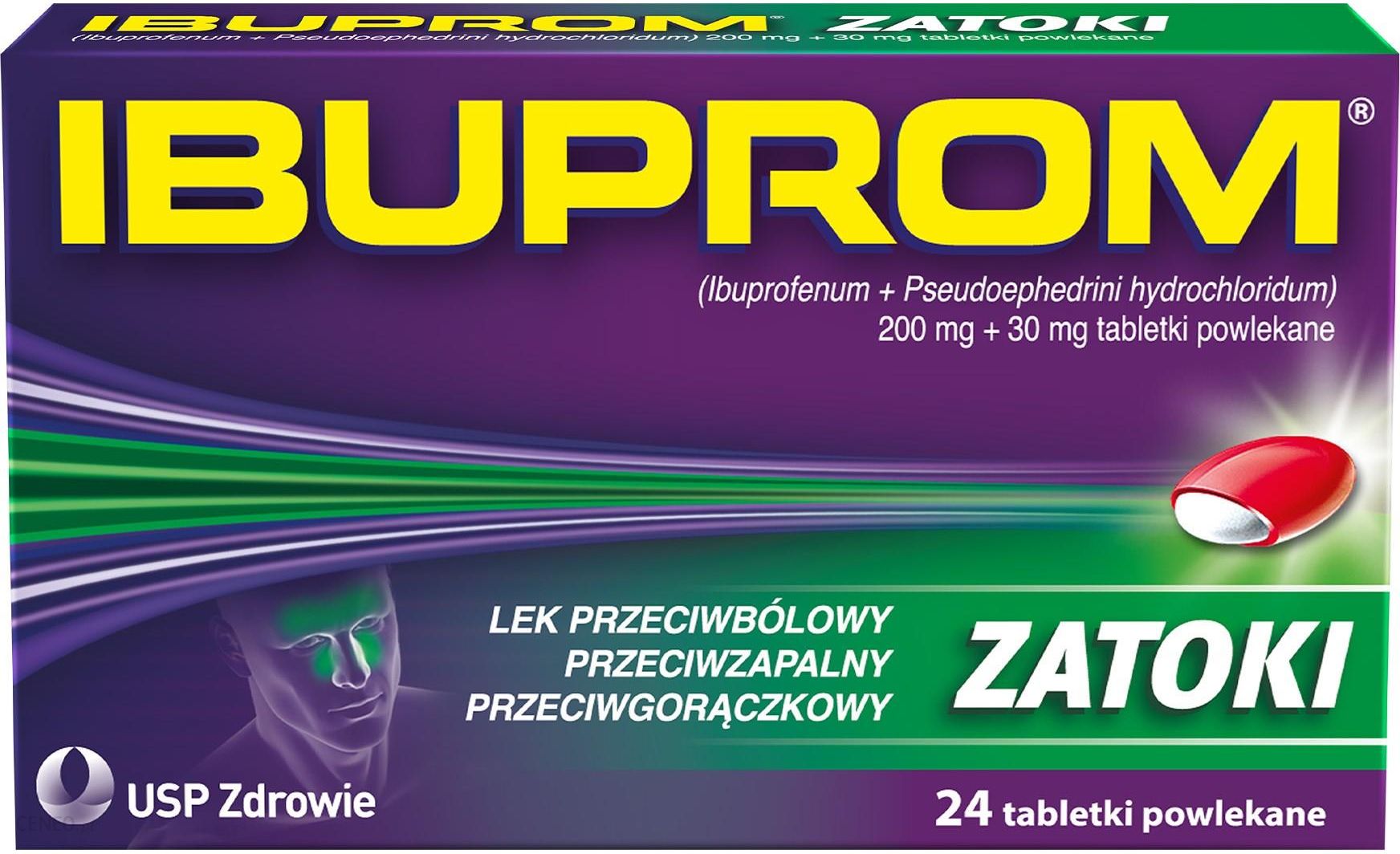 IBUPROM ZATOKI 24 tabl.Ibuprom Zatoki jest lekiem wskazanym do stosowania doraźnego celem złagodzenia objawów występujących w przeziębieniu i grypie, takich jak: ból głowy, katar, gorączka, ból i niedrożność zatok obocznych nosa, ból gardła oraz bóle mięśniowe. Polecany również do stosowania celem doraźnego leczenia objawów zapalenia zatok, takich jak: ból głowy, niedrożność zatok i nosa, które przebiegają z bólem i są konsekwencją powikłań przeziębienia, grypy lub alergicznego nieżytu nosa. Lek adresowany do osób dorosłych oraz młodzieży powyżej 12. roku życia.