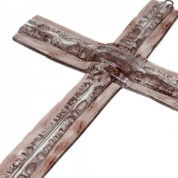 Szklany krzyż na ścianę wykonany z brązowego, barwionego szkła, pełnego lśniących bąbelków o różnych rozmiarach i kształtach. Kolor brązowy ma szeroką gamę odcieni – od ciemnobrązowego do różowawego.Szklane krzyże WAGA są wykonywane i malowane ręcznie, co sprawia, że każdy z elementów posiada swój oryginalny i niepowtarzalny charakter.wymiary: 15 x 24 cm