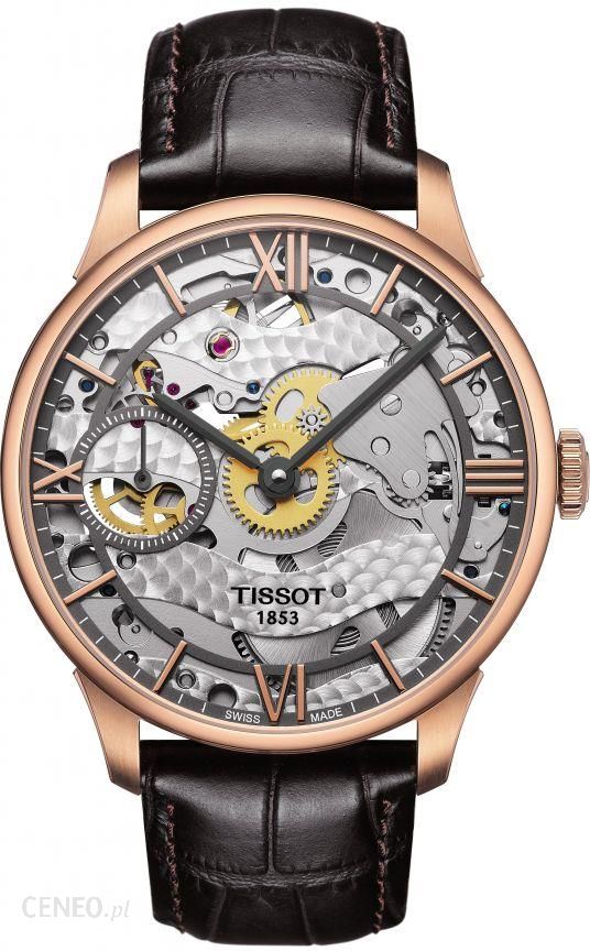 Tissot T0994053641800 jest to elegancki zegarek męski z kolekcji Chemin des Tourelles Squelette.Zegarek wyposażony jest w mechanizm mechaniczny ETA 6497-1, który do zasilania wykorzystuje energię z nakręcania sprężyny. Szkiełko szafirowe zapewnia bardzo wysoką odporność na zarysowania oraz przejrzystość. Mechanizm zegarka został umieszczony w okrągłej kopercie z wysokiej jakości stali szlachetnej w kolorze różowego złota, pozłacanej PVD. Pasek wykonany ze skóry w kolorze brązowym, podkreśla elegancki charakter zegarka. Szczególną cechą zegarka jest przezroczysta tarcza ukazująca mechanizm. Wodoszczelność na poziomie 50 m (5 ATM, 5 Bar) pozwala na kąpiel, czy mycie samochodu z zegarkiem.Sprzedawany przez firmę MARKO zegarek jest fabrycznie nowym, oryginalnym produktem firmy Tissot, pochodzącym z legalnej i oficjalnej dystrybucji. Zapakowany w firmowe opakowanie, nadaje się idealnie na prezent. Na życzenie oferujemy bezpłatny grawer.Dostawa zegarka jest bezpłatna. Istnieje możliwość obejrzenia go na żywo w sklepach MARKO oraz sklepach partnerskich (informacja o punktach znajduje się w zakładce O nas). Model zegarka objęty jest 2 letnią gwarancją producenta oraz Pakietem Korzyści Marko. Zegarek dostępny na raty.