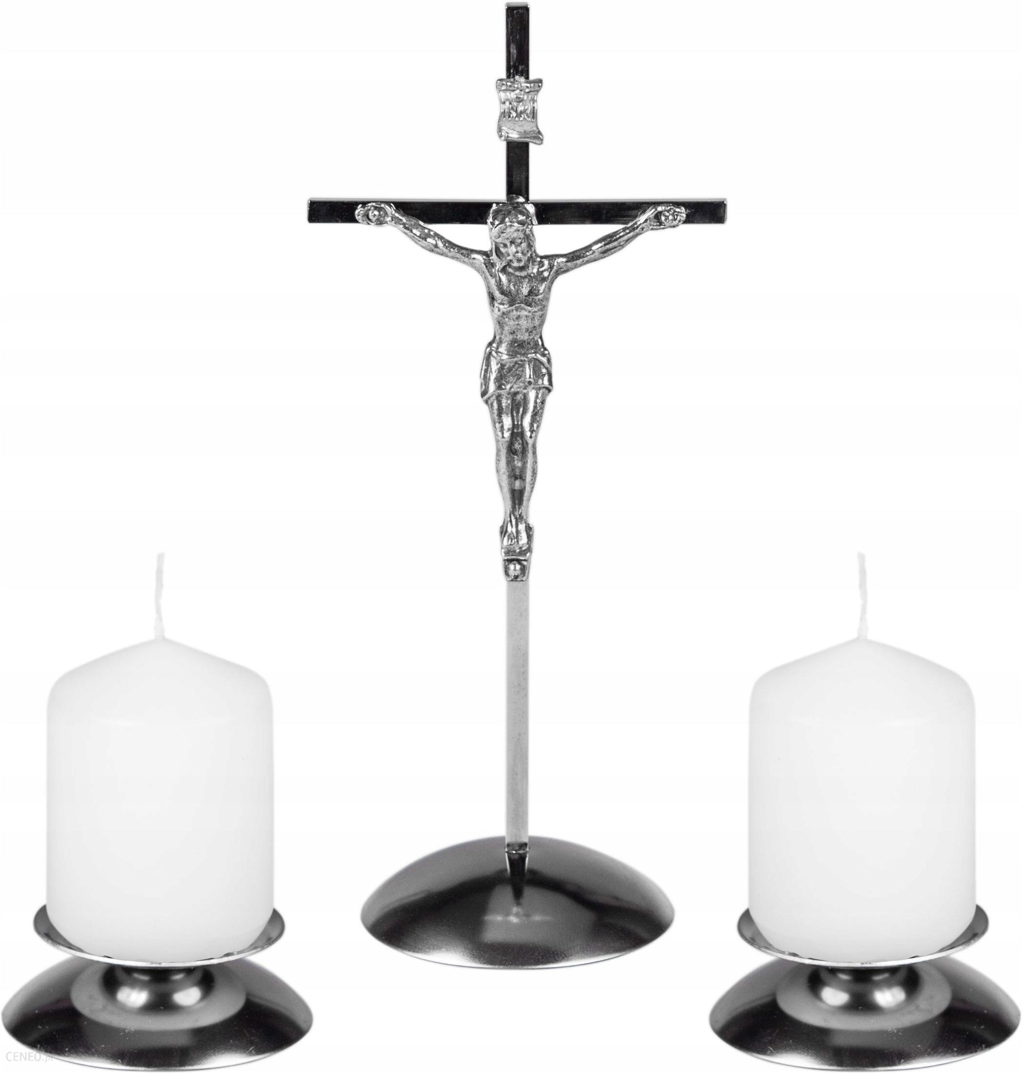 Zestaw kolędowy 002Wykonany ze stali nierdzewnej.Kolor – srebrny.W komplecie 2 świeczki Wymiary:Pasyjka: 19,5 x 7 cmwysokość lichtarza: 2,5 cmśrednica: 5,5 cm.